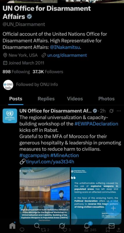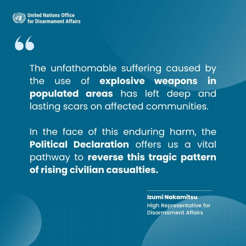 وأعرب مكتب الأمم المتحدة لشؤون نزع السلاح عن امتنانه لوزارة الشؤون الخارجية والتعاون الإفريقي والمغاربة المقيمين بالخارج على حفاوة الاستقبال والدور الريادي الذي تضطلع به المملكة في تعزيز المبادرات الإنسانية الرامية إلى تقليص الأضرار التي تلحق بالمدنيين جراء استخدام الأسلحة المتفجرة.