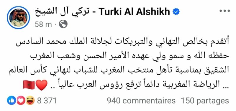 تركي آل الشيخ يهنئ الملك محمد السادس والشعب المغربي بتأهل أشبال الأطلس إلى نهائي كأس العالم