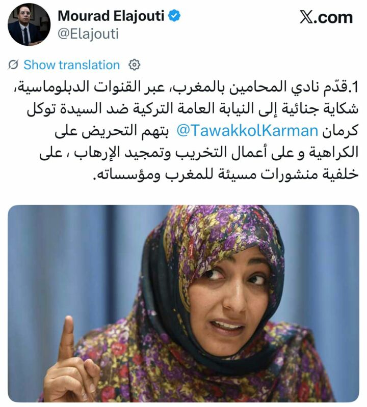 تقدّم نادي المحامين بالمغرب، برئاسة المحامي مراد العجوطي، بشكوى جنائية رسمية إلى النيابة العامة التركية عبر القنوات الدبلوماسية، ضد الناشطة اليمنية توكل كرمان، يتهمها فيها بالتحريض على الكراهية والدعوة إلى أعمال تخريب وتمجيد الإرهاب. وتأتي هذه الخطوة القضائية على خلفية منشورات وصفت بالمسيئة للمملكة المغربية ولمؤسساتها الرسمية.