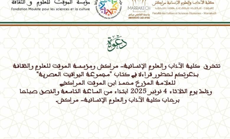 تنظم كلية الآداب والعلوم الإنسانية بمراكش، بتعاون مع مؤسسة الموقت للعلوم والثقافة، ندوة فكرية لتقديم كتاب “مجموعة اليواقيت العصرية “، لمؤلفه المؤرخ العلامة محمد ابن الموقت المراكشي، والصادر مؤخرا بتحقيق الباحث في الثقافة والتراث المغربي الأستاذ أحمد متفكر.