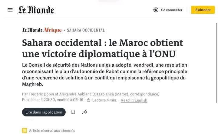 أما صحيفة لوموند الفرنسية فقد عنونت بدورها تقريرها بـ “Sahara occidental : le Maroc obtient une victoire diplomatique à l’ONU”، مؤكدة أن “المغرب حقق انتصاراً دبلوماسياً في الأمم المتحدة”، بعد أن اعتمد مجلس الأمن قراراً جديداً يعترف بمخطط الحكم الذاتي الذي تقدمت به الرباط كـ “مرجع رئيسي في البحث عن حل لنزاع يُسمّم الجغرافيا السياسية في منطقة المغرب العربي”.