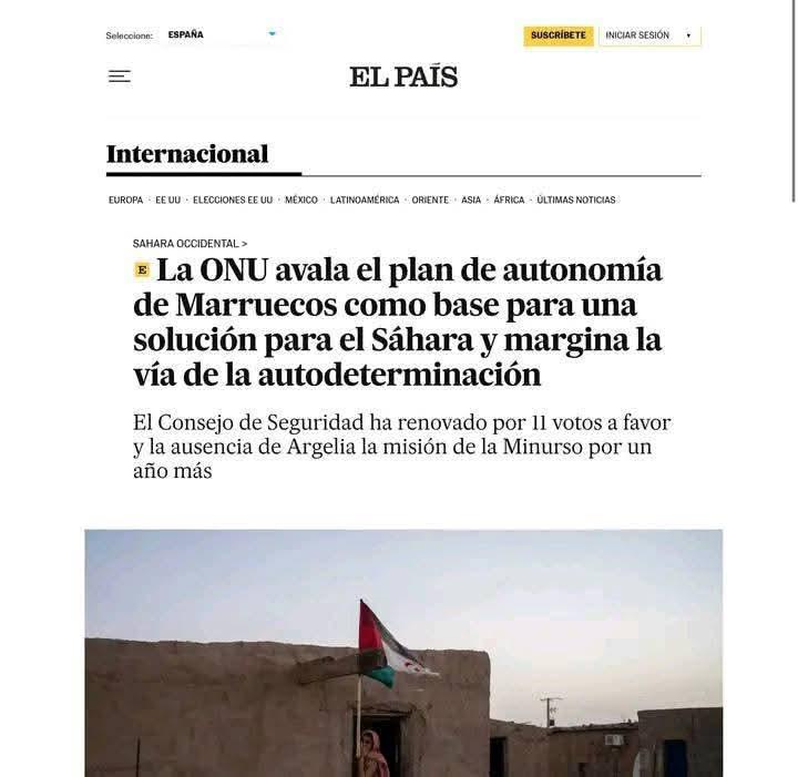 ففي تقريرها المعنون بـ “La ONU avala el plan de autonomía de Marruecos como base para una solución para el Sáhara y margina la vía de la autodeterminación”، كتبت صحيفة إلباييس الإسبانية أن الأمم المتحدة “دعمت مخطط الحكم الذاتي المغربي كأساس لحل دائم لقضية الصحراء، في وقت همّشت فيه نهائياً خيار تقرير المصير”. وأشارت الصحيفة إلى أن مجلس الأمن صوّت بأغلبية 11 صوتاً لصالح القرار، مع غياب الجزائر عن الجلسة، مجدداً مهمة بعثة “المينورسو” لسنة إضافية.