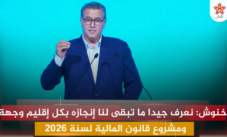 "مسار الإنجازات" ببني ملال.. أخنوش: نعرف جيدا ما تبقى لنا إنجازه بكل إقليم وجهة ومشروع قانون المالية لسنة 2026 يوازن بين الدعم الاجتماعي والتحفيز الاقتصادي من أجل نموذج تنموي جديد كما أشار إليه جلالة الملك