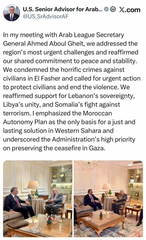 مسعد بولس: أكدت في لقائي مع الأمين العام لجامعة الدول العربية ان مبادرة الحكم الذاتي المغربية هي الحل الوحيد والعادل لقضية الصحراء