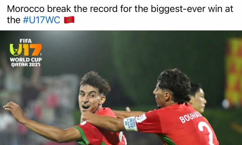 في إنجاز غير مسبوق، حقق المنتخب المغربي لأقل من 17 سنة فوزاً كاسحاً بنتيجة 16-0 على منتخب كالودينيا الجديدة، ليحطم بذلك الرقم القياسي لأكبر انتصار في تاريخ كأس العالم للناشئين، وفق ما أعلنته الصفحة الرسمية للاتحاد الدولي لكرة القدم “فيفا” التي نشرت صورة لفرحة اللاعبين وكتبت: “Morocco break the record for the biggest-ever win at the #U17WC” مرفقة بالعلم المغربي.