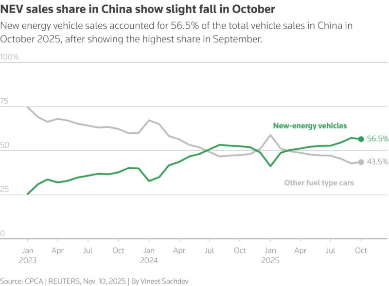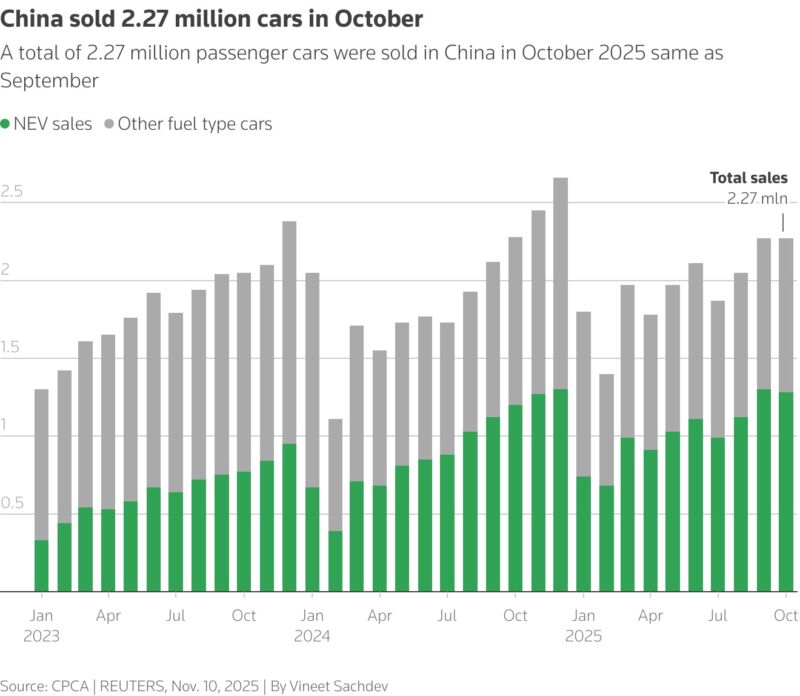 أما على مستوى مبيعات التجزئة، فقد تم بيع 1.282 مليون سيارة عاملة بالطاقة الجديدة خلال أكتوبر، بزيادة سنوية قدرها 7.3 في المائة رغم انخفاض شهري طفيف بنسبة 1.3 في المائة.