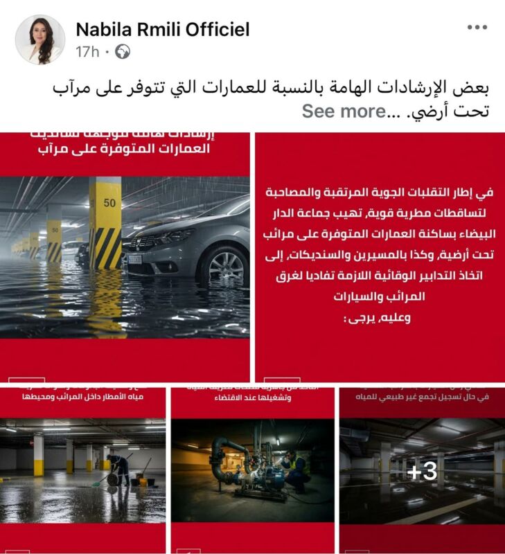 في ذات السياق، قامت عمدة مدينة البيضاء، بنشر مجموعة من التوجيهات عبر صفحتها الرسمية على “الفيسبوك”، دعت خلالها المواطنين إلى التواصل مع الشركة الجهوية متعددة الخدمات فور ملاحظتهم لأي تجمع مائي أو سيول قريبة من أماكن تواجدهم.