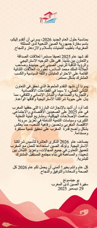 وأبرزت السفيرة، أن سنة 2025 شكّلت محطة مهمة في مسار العلاقات الثنائية، حيث شهدت تعاونًا متناميًا بين الرباط وبكين في ظل التوجيهات الاستراتيجية لرئيس جمهورية الصين الشعبية شي جينبينغ، وصاحب الجلالة الملك محمد السادس.