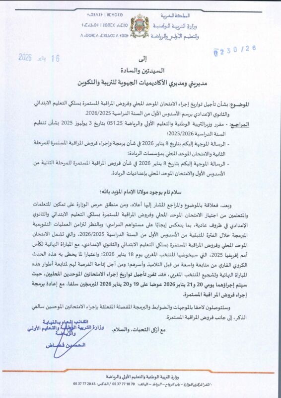 أعلنت وزارة التربية الوطنية والتعليم الأولي والرياضة، يوم الجمعة 16 يناير 2026، عن قرارها الرسمي القاضي بتأجيل تواريخ إجراء الامتحان الموحد المحلي وفروض المراقبة المستمرة بسلكي التعليم الابتدائي والثانوي الإعدادي، برسم الأسدوس الأول من الموسم الدراسي 2025/2026، وذلك تزامنًا مع المباراة النهائية لكأس أمم إفريقيا التي سيخوضها المنتخب الوطني المغربي.