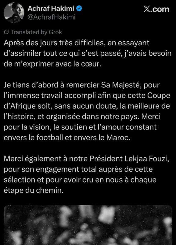 حكيمي، الذي يُعد أحد أبرز رموز الجيل الذهبي لكرة القدم المغربية، أكد في تدوينته أن ما عاشه في نهائي كأس أفريقيا لم يكن سهلًا على المستوى الإنساني والذهني، مشيرًا إلى أنه احتاج وقتًا لاستيعاب ما حدث قبل أن يقرر التعبير عمّا بداخله بصدق وهدوء، بعيدًا عن الانفعال أو التبرير.