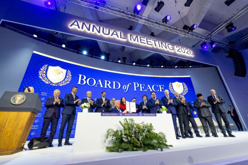 وشهد حفل توقيع ميثاق مجلس السلام، المنظم على هامش المنتدى الاقتصادي العالمي بدافوس، مشاركة نحو 20 من رؤساء الدول والحكومات وكذا وزراء شؤون خارجية الدول الموقعة، ومنها على الخصوص، تركيا والمملكة العربية السعودية ومملكة البحرين ومصر وإندونيسيا وأذربيجان والأرجنتين…