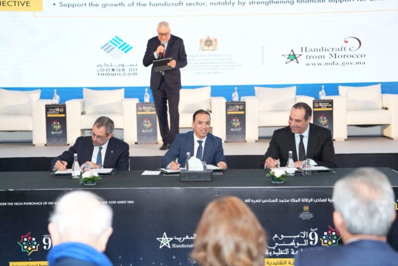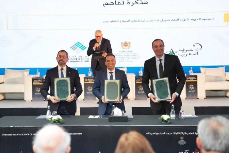 وفي هذا السياق، تم توقيع مذكرة تفاهم لتيسير ولوج فاعلي قطاع الصناعة التقليدية إلى آليات التمويل والضمان، جمعت بين كتابة الدولة المكلفة بالصناعة التقليدية والاقتصاد الاجتماعي والتضامني، ودار الصانع، ومؤسسة تمويلكم، بهدف تمكين الفاعلين من حلول تمويلية وضمانات ملائمة موجهة للاستثمار المنتج، ودعم تطوير صادرات ذات قيمة مضافة عالية.