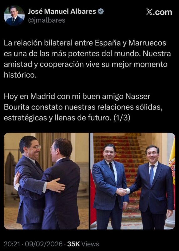 وجاء هذا الموقف في تدوينة نشرها ألباريس على حسابه الرسمي بمنصة “إكس”، عقب لقائه، اليوم في مدريد، بوزير الشؤون الخارجية والتعاون الإفريقي والمغاربة المقيمين بالخارج، ناصر بوريطة، حيث عبّر عن اعتزازه بمستوى العلاقات التي تجمع الرباط ومدريد، واصفًا إياها بـ«العلاقات الصلبة، الاستراتيجية، والمليئة بآفاق المستقبل».
