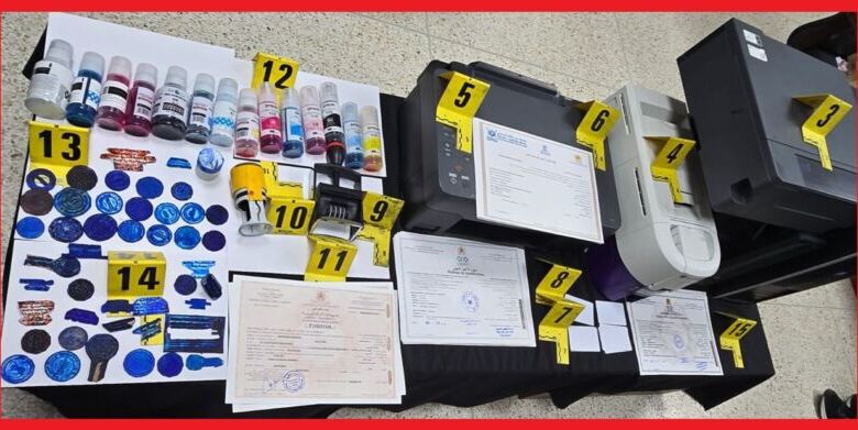 وقد قادت عملية الضبط والتفتيش المنجزة بدخل نادي الأنترنت ومنزل المشتبه فيه الرئيسي عن حجز 48 دبلوما وشهادة دراسية وبيانات للنقط مزورة، علاوة على 41 خاتما إداريا مزيفا، وكذا ثلاثة حواسيب وثلاث أجهزة للطباعة تستخدم في تسهيل ارتكاب هذه الأفعال الإجرامية.
