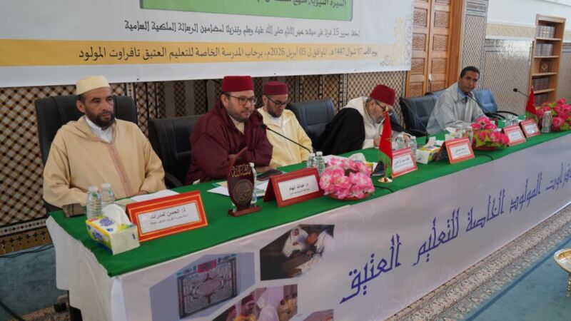 احتفاء بمرور 15 قرنا على ميلاذ خير الأنام محمد صلى الله عليه وسلم ، نظمت المدرسة الخاصة للتعليم العتيق تافراوت المولود يومه الأحد 05 أبريل 2026 ندوة علمية وطنية بعنوان ” السيرة النبوية منهج منكامل لبناء الإنسان وتشييد العمران ” ، وذلك بشراكة مع فريق الدراسات الشرعية تأصيل وتجديد التابع لمختبر الإجتهاد المعاصر أسس وقضايا ، وبتنسيق مع المجلس العلمي المحلي بتزنيت والمندوبية الإقليمية لوزارة الأوقاف بتزنيت .