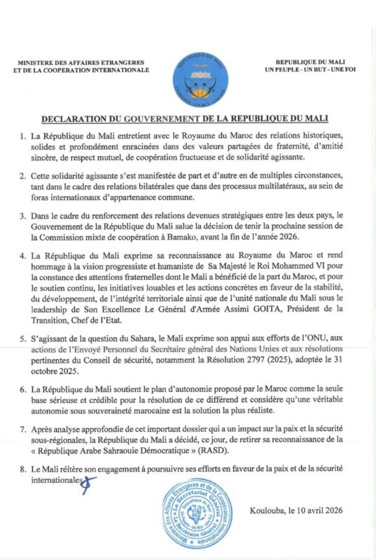 وجاء هذا الإعلان في بيان رسمي للحكومة المالية، تلاه وزير الشؤون الخارجية والتعاون الدولي عبد الله ديوب، خلال ندوة صحفية مشتركة مع نظيره المغربي ناصر بوريطة، بمناسبة زيارة صداقة وعمل قام بها هذا الأخير إلى باماكو.