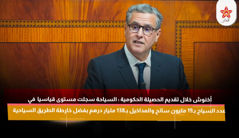 الرئيسية/سلايدر/أخنوش خلال تقديم الحصيلة الحكومية : السياحة سجلت مستوى قياسيا في عدد السياح بـ19 مليون سائح والمداخيل بـ138 مليار درهم بفضل خارطة الطريق السياحية سلايدرفيديو أخنوش خلال تقديم الحصيلة الحكومية : السياحة سجلت مستوى قياسيا في عدد السياح بـ19 مليون سائح والمداخيل بـ138 مليار درهم بفضل خارطة الطريق السياحية 15 أبريل، 2026 15 أبريل، 2026 فيسبوك X لينكدإن Tumblr بينتيريست Reddit VKontakte واتساب تيلقرام مشاركة عبر البريد طباعة