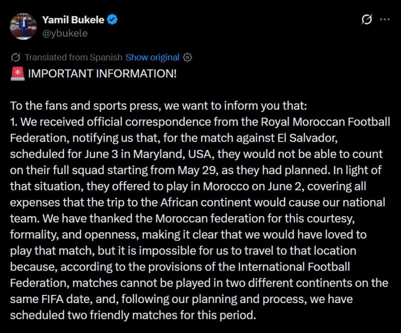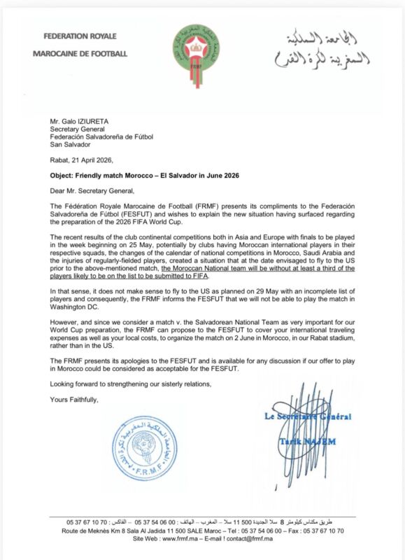 من جانبه، كشف رئيس الاتحاد السلفادوري لكرة القدم، ياميل بوكيلي، عبر تدوينة على منصة “إكس”، تفاصيل المراسلة التي توصل بها من الجانب المغربي، مؤكداً استحالة خوض المباراة في القارة الإفريقية، رغم الترحيب الكبير الذي أبداه المغرب واستعداده لتحمل جميع التكاليف.
