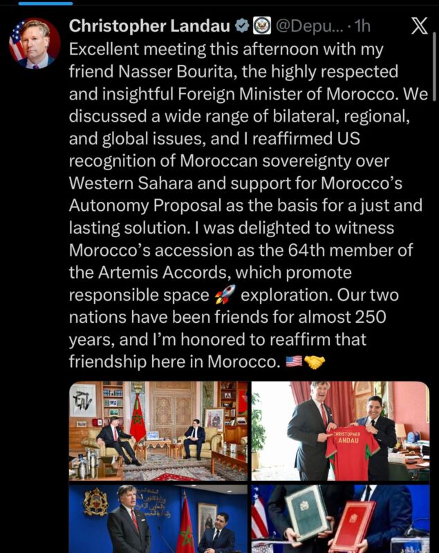 كما عبّر المسؤول الأمريكي عن ارتياحه لانضمام المغرب إلى اتفاقيات أرتميس كعضو رقم 64، وهي اتفاقيات تروم تعزيز الاستكشاف السلمي والمسؤول للفضاء، معتبراً أن هذا الانخراط يعكس المكانة المتقدمة التي باتت تحتلها المملكة في مجالات التكنولوجيا والابتكار والشراكات المستقبلية.