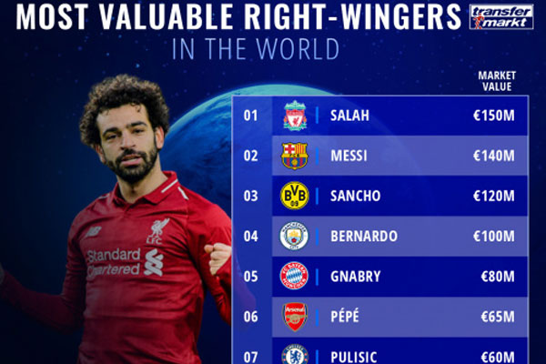 رصد موقع “ترانسفر ماركت” العالمي المتخصص في الإحصائيات والقيمة السوقية للاعبي كرة القدم النجوم الأغلى على مستوى العالم، والتي شهدت تفوق الدولي المصري محمد صلاح نجم ليفربول الإنجليزي على الأرجنتيني ليونيل ميسي نجم برشلونة الإسباني في قائمة أغلى الأجنحة اليمنى.