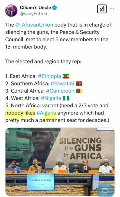 أحدث هذه الإخفاقات جاء في مجلس السلم والأمن الإفريقي، حيث فشلت الجزائر في تحقيق أي تقدم يعزز موقفها الإقليمي، وهو ما دفع بعض المتابعين إلى التعليق بعبارات تعكس هذا التراجع، مثل ما نشرته صفحة Eritrea Digest على منصة X بقولها: “لم يعد أحد يحب الجزائر”.