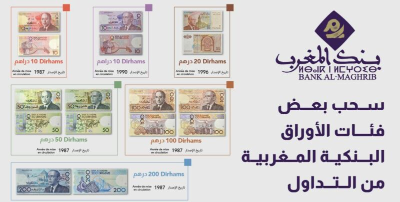 وأوضح البلاغ أن القرار يأتي استنادًا إلى مقتضيات المرسوم رقم 2.25.966 الصادر بتاريخ 23 دجنبر 2025، ويهم أوراقًا بنكية تم طرحها للتداول خلال سنوات سابقة، تشمل فئات 10 و50 و100 و200 درهم الصادرة سنة 1987، بالإضافة إلى ورقة 10 دراهم الصادرة سنة 1990، وورقة 20 درهم الصادرة سنة 1996.