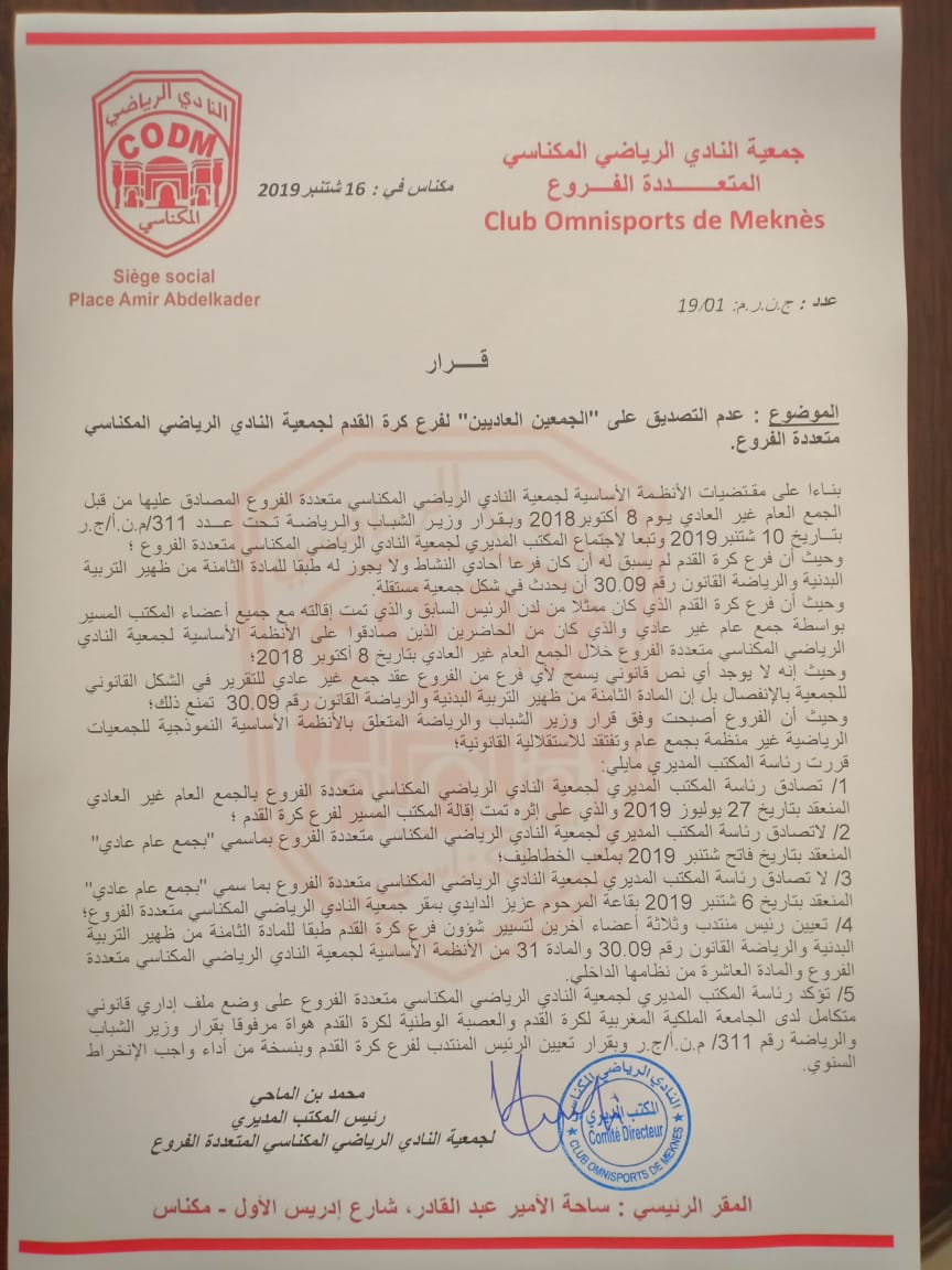 وحسب بلاغ رسمي، توصل موقع الدار بنسخة منه، فقد عين المكتب رئيس منتدب وثلاثة أعضاء آخرين لتسيير شؤون فرع كرة القدم طبقا للمادة الثامنة من ظهير التربية البدنية والرياضة القانون رقم 30.09والمادة 31 من الأنظمة الأساسية لجمعية النادي الرياضي المكناسي متعددة الفروع والمادة العاشرة من نظامها الداخلي.
